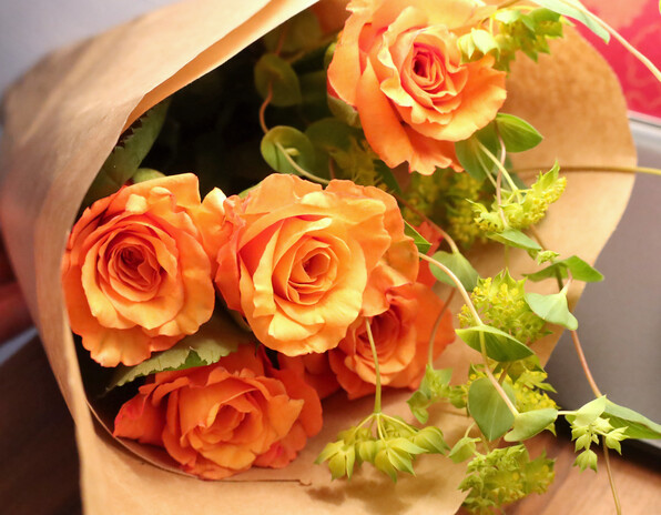●オレンジのバラを買うことにしました。5本あったので、5本購入。先日から気に入っているブプレウルムを1本添えてもらいました。