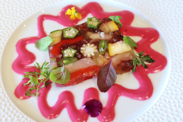 ●野菜のテリーヌに、なんとフォションピンクのソースでした。ベトラーヴ(ビーツ)で色付けされていました。