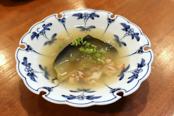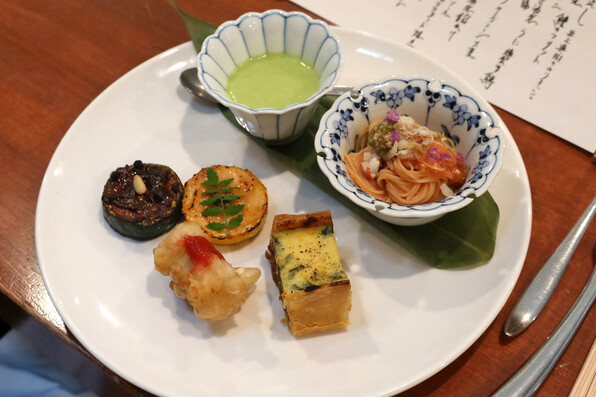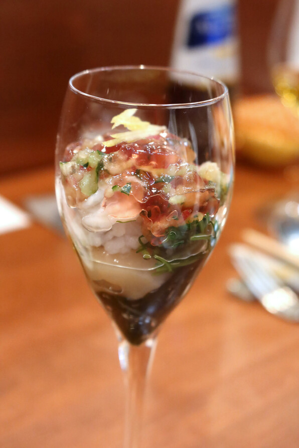 燻製帆立、鱧、坊主ごろし(岩もずく)、赤紫蘇ジュレ