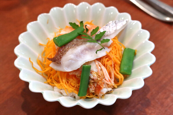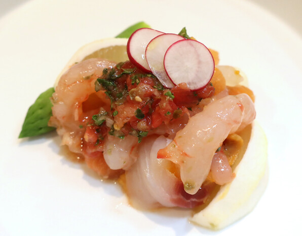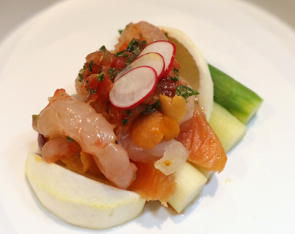 天然真鯛昆布〆、甘海老、雲丹、燻製本鱒、京トマト、アスパラガス、日向夏