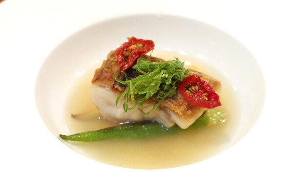 甘鯛のアクアパッツァ風 。おくら、ヤングコーン、天日干しトマトと。