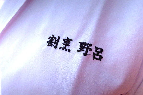 ●シェフののろっち=野呂和美さん、コックコートではなく、この会専用の、割烹コスチュームです。