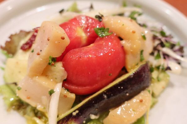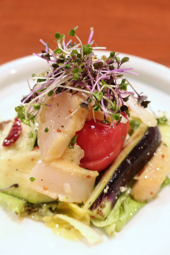 ●水茄子と燻製帆立、フルーツトマトのサラダ