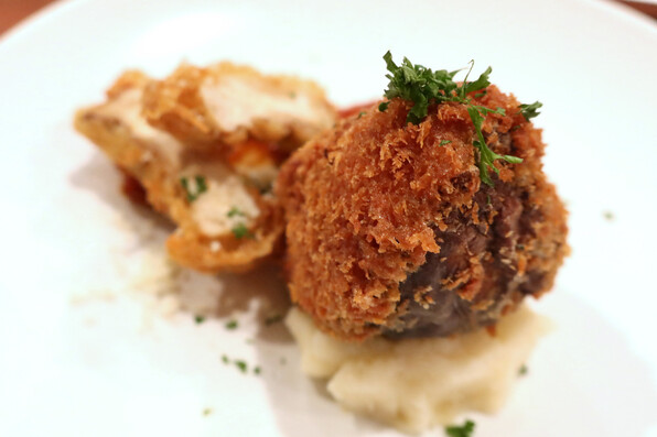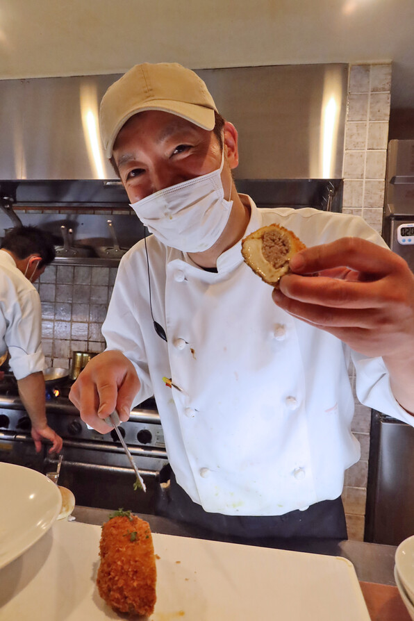●でも半分に割ると、神山しいたけの形が現れ、椎茸肉詰めフライとわかりました。軸部分はフリットになっていました。食べるウスターソースと共に。