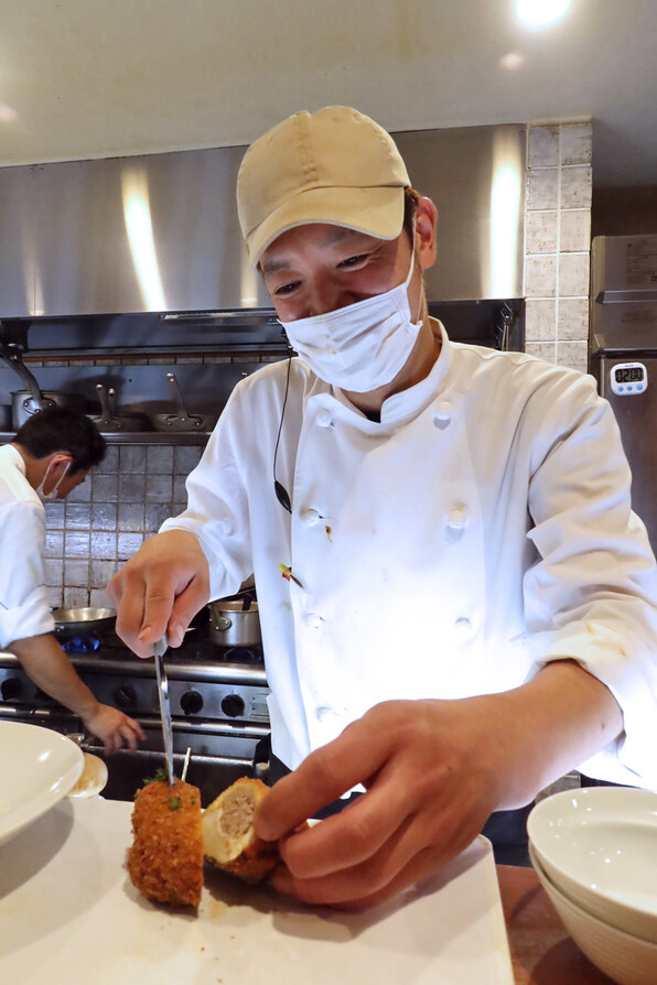●肉詰め椎茸を、いったん引き上げ、半分にカットしてくれました。