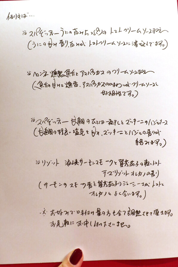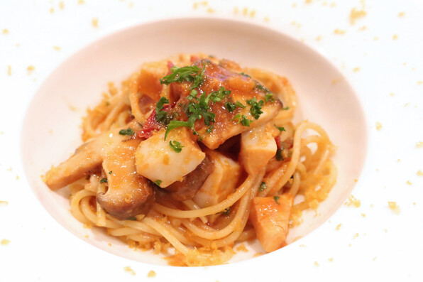 ●めいち鯛、燻製帆立、神山しいたけのパスタ、からすみと。