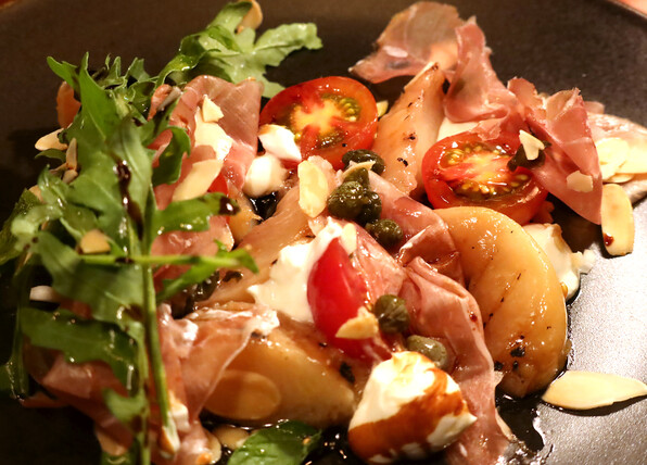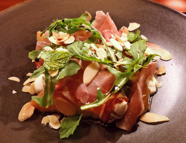 ●前後しますが、前菜にお願いしたのは、レモンとレモングラス、ミントでコンポートした後グリルした桃と、燻製した生ハム(イタリアのスペック)のサラダ。オリーヴオイルとバルサミコ、トマトと水分を抜いたほとんどリコッタのようなヨーグルト、さらにケイパーやスライスしたアーモンドやセルバチコが粋な香味と食感を添えて、たまらなく美味なひと皿でした。心を奪われました。