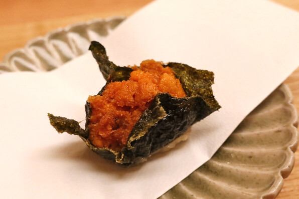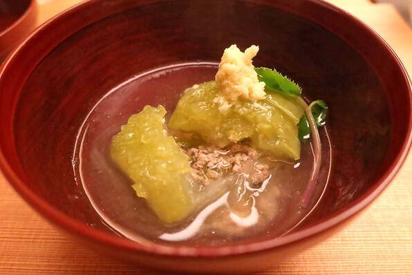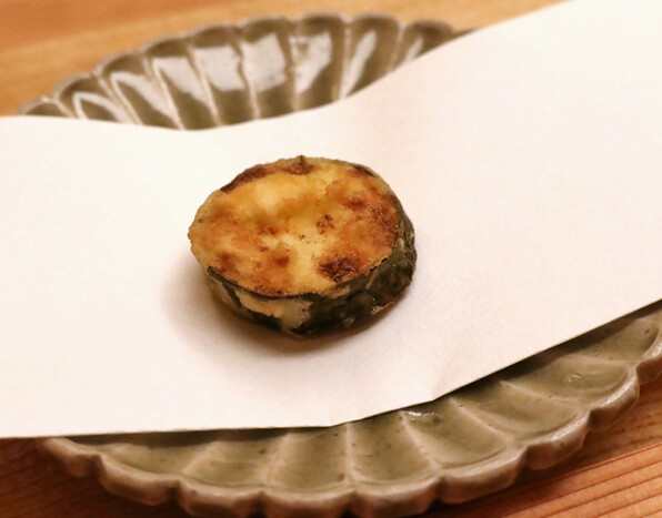 ●一品め、茄子をやわらかにつぶしたものに、雲丹。酸味のジュレは生姜入りです。