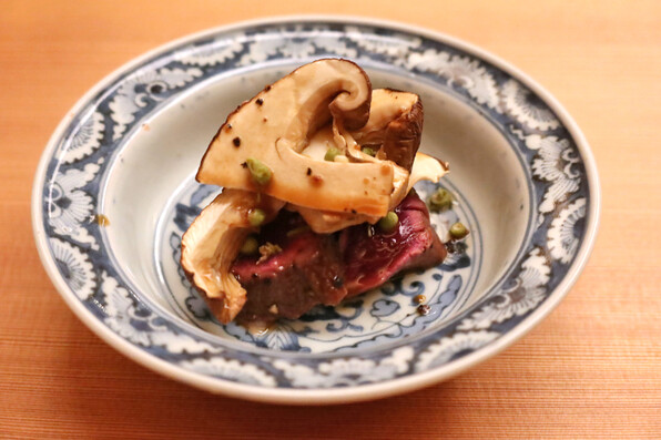 ●歯が要らないほど柔らかい牛肉は木下牧場の近江牛。たっぷりの野菜は青とうがらしとシャンツァイのソースと。