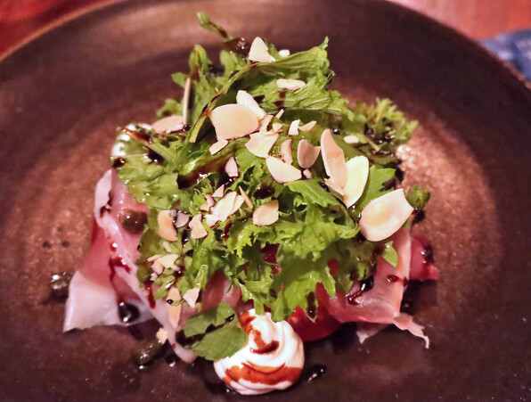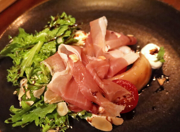 これ大好きな前菜の品です。グリルした桃と、燻製生ハムのサラダ。火が入った桃に、燻した生ハムよ。何もしないでも美味な食材がよりおいしくなっていて、それらがかけ合わされていて、旨くないわけはないでしょう☆☆☆