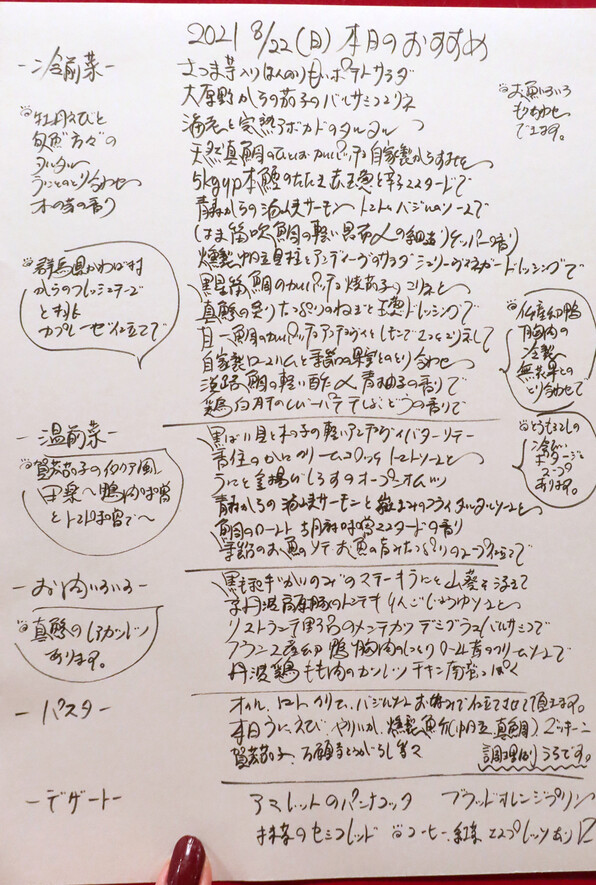 2021年8月22日(日)、18時半~20時 「リストランテ 野呂」261回目。