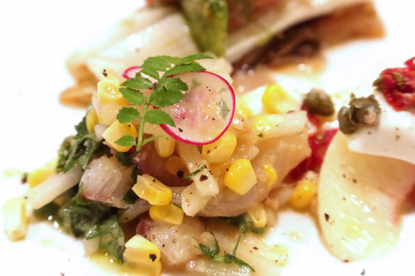 ・嶽きみ、梨、燻製した鯛、ラディッシュ、ケイパー、大葉、木の芽