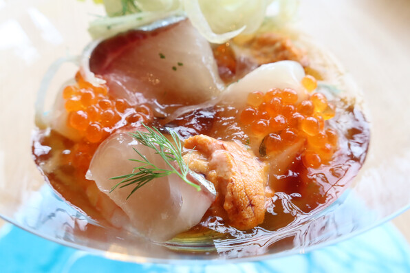 ●帆立のポーチ、帆立のフレッシュさを生かしており、そこにカラマンシー(柑橘)ぽん酢です。おだしを少し合わせてあり、なごめる味。いくらに大根で紅白おめでたいですという作り。かわいい、きれい(^o^)