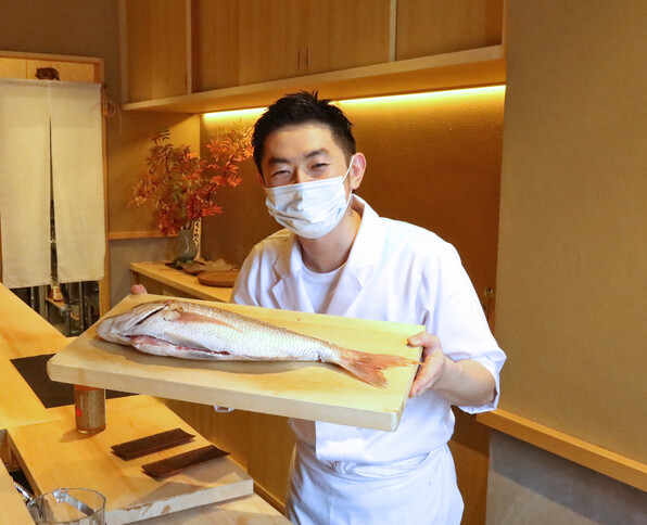 ●明石からの、水口さんの鯛を切る前にプレゼンしてくれる店主の酒井研野さん。