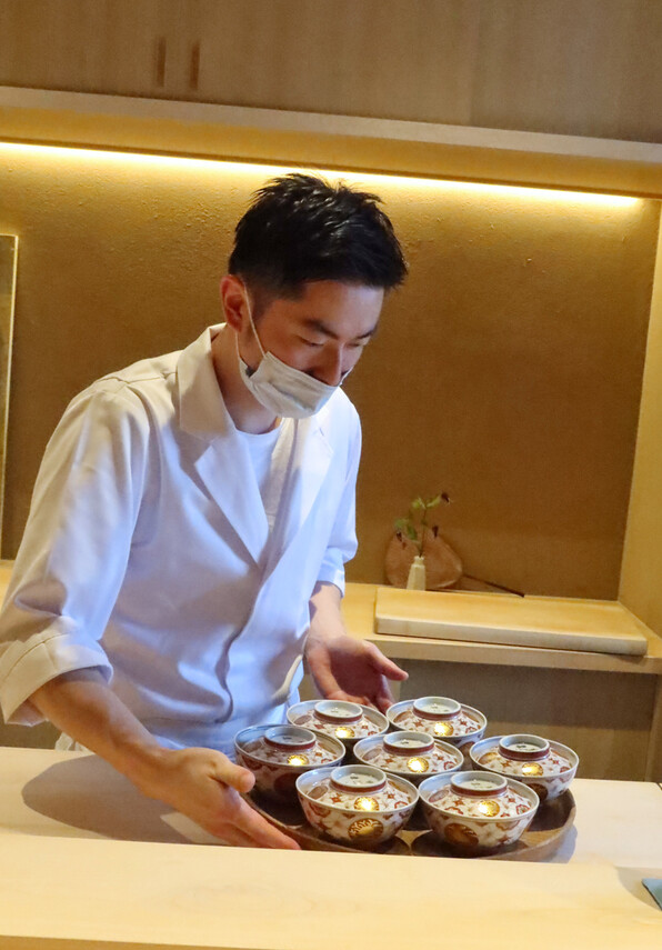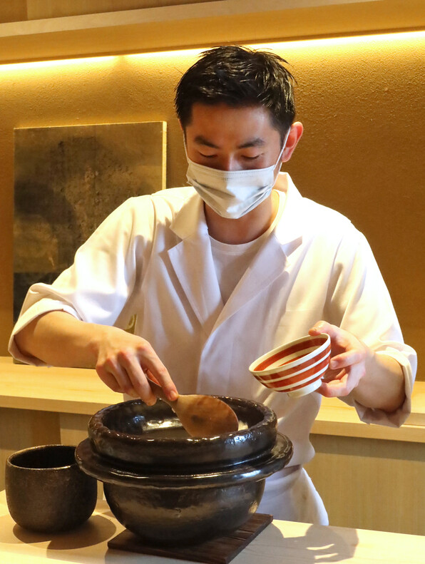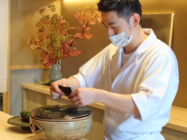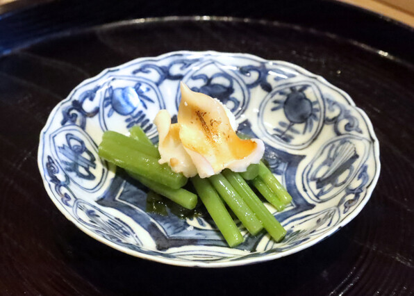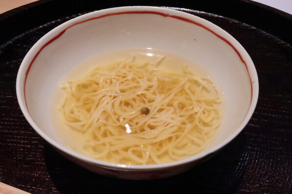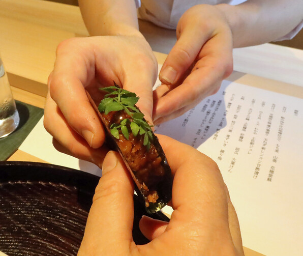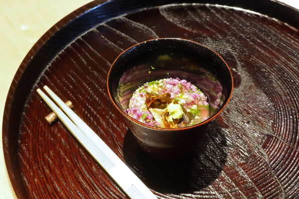 薬味ジュレは、大根おろし、青ねぎ、おろし生姜、だしのジュレで作られたもので、いまだかつてない爽やかでいてピリッとした、旨味と才気を同時に感じさせる味わいです。