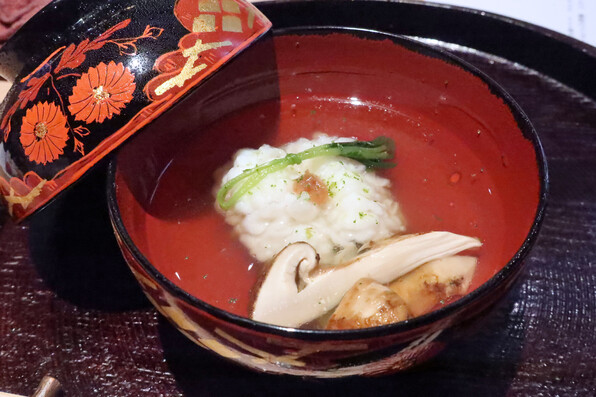 ●鱧に見えるけれど、伝助穴子を骨切りしたものです。松茸と。