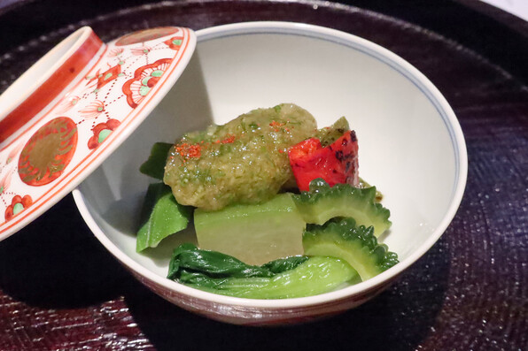 夏野菜の冷やし炊き合わせ、薬味ジュレ。