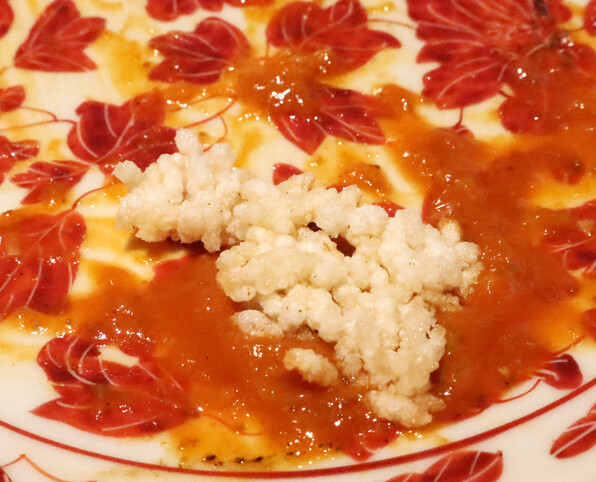 ●余ったソースでまた新たな楽しみがあり、蟹を食べ終わったタイミングで、おこげが供されます。パリパリと、これがまた旨いのです。煎餅みたいにこれだけ食べてもおいしいところに、やば旨いトマト餡からめますよっと。もう本当に天国に行ったまま帰って来られません。