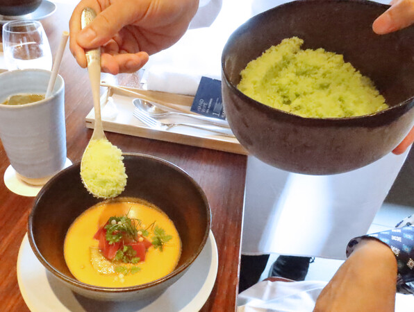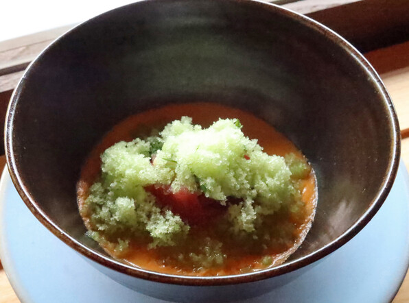 本まぐろと賀茂茄子 トマトのガスパチョ。それだけでも十分うれしいのに、