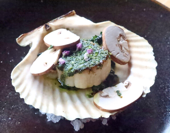火の入った甘いほたて貝に、大葉でブルゴーニュ風、香りがよかったです。激しくOKです\(^o^)/