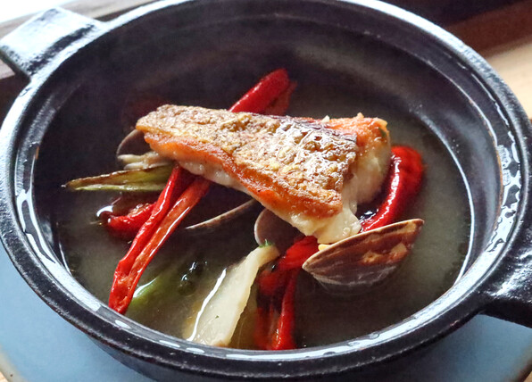 定番名作料理、いぶりがっこ、実山椒入りのアクアパッツァです。魚は真鯛。
