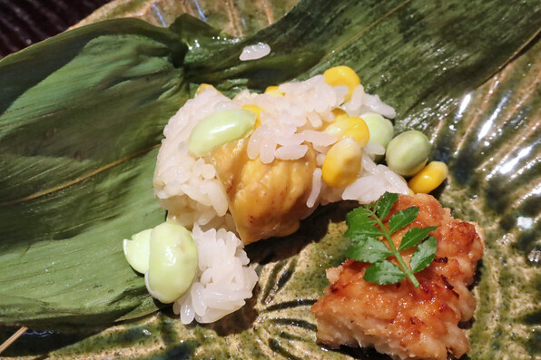●栗と枝豆の飯蒸し、笹の葉包みに、