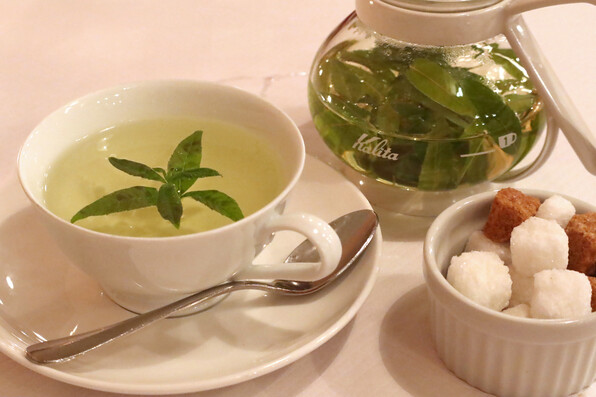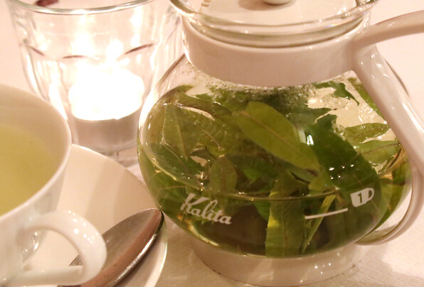 お店の前の植木鉢で自家栽培して作られたヴェルヴェーヌを天日干ししたものということ。カップに浮かぶのはフレッシュな葉っぱ。