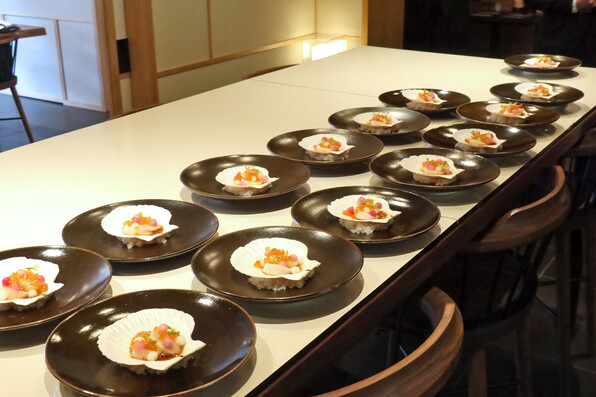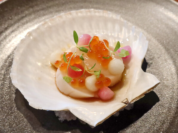 ●帆立のポーチ、帆立のフレッシュさを生かしており、そこにカラマンシー(柑橘)ぽん酢です。おだしを少し合わせてあり、なごめる味。いくらに大根で紅白おめでたいですという作り。かわいい、きれい(^o^)