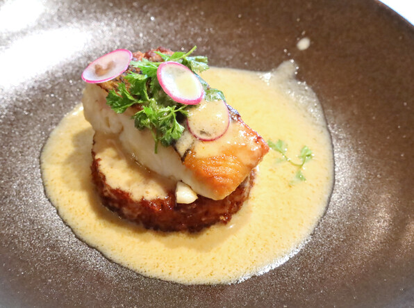 ●真鯛のポワレ、下にはカリカリに焼いて風味のいい南瓜のリゾットです。