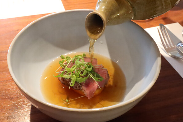 先日のおうどんいただいたのと同じおだしがひたひたかけられて供されました・・・なんと斬新なこと\(^o^)/