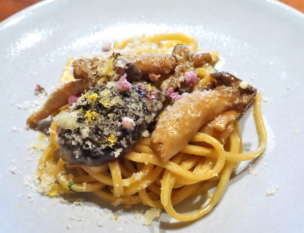 きのこたっぷりです。花穂紫蘇と柚子。パルミジャーノ。