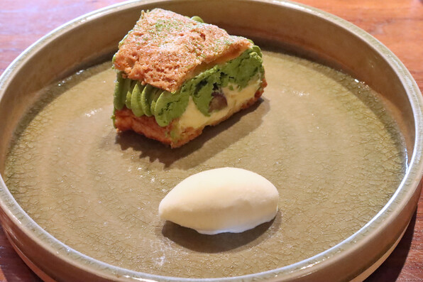 添えられているのは生姜のアイスクリームです。これがまた粋な味で、パリ二寧坂の香味を引き立てました。