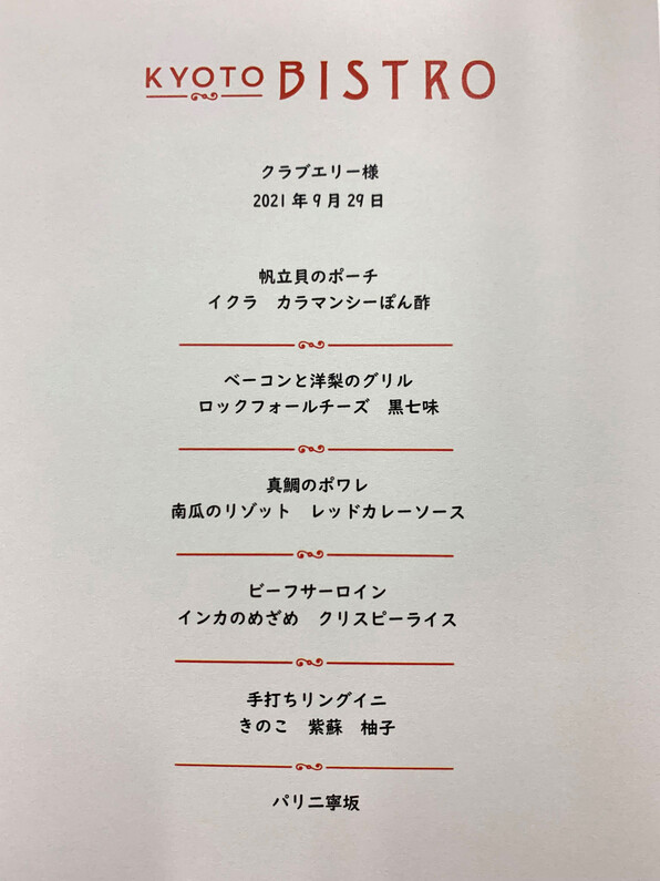 ●9月最後のクラブエリーはパーク ハイアット 京都「KYOTO BISTRO」さんで開催。