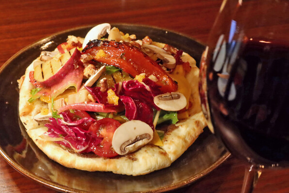 ピッツァ生地の台に、マッシュルームの香味を塗りつけて、その上にわんさか野菜をのせてあります。