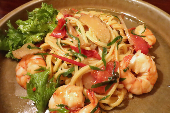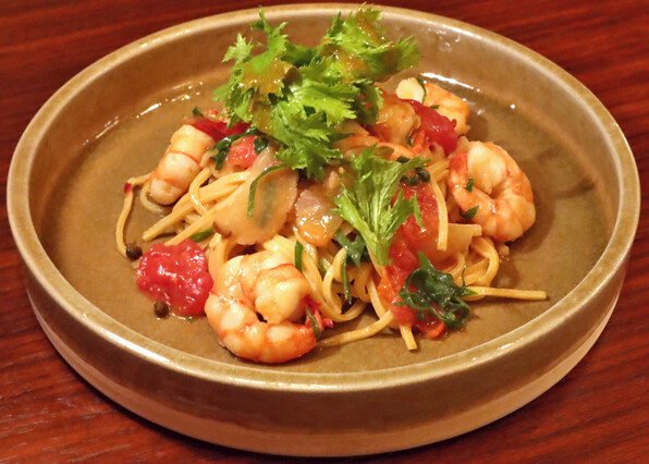 ●いぶりがっこ、実山椒がアクセントの粋なパスタ。トマトの赤が鮮やか、梅風味もほんのりと。