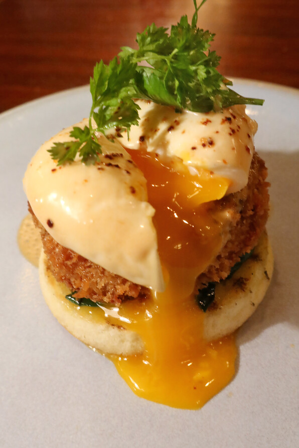 エッグベネディクト、エスプーマにしたビスクのソース、下にチョリソー入り蟹のコロッケ。その下にほうれん草、マフィン。