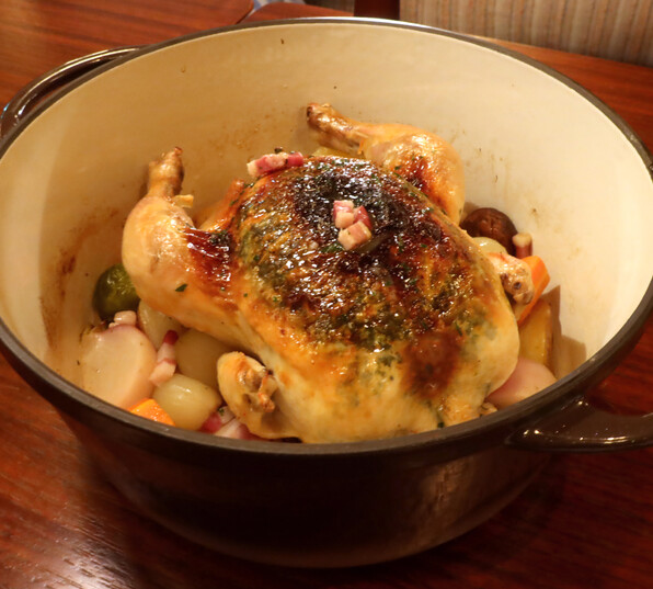 ●ココットでどかんと鶏肉です。紫蘇バターをドゥミドゥイユ状態で詰めたひな鳥、野菜もたっぷりと。