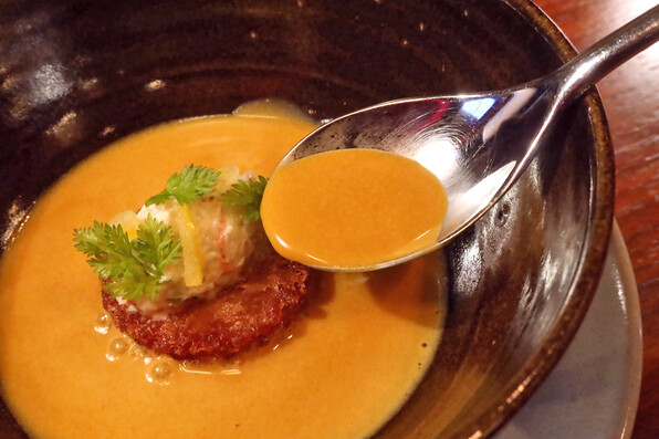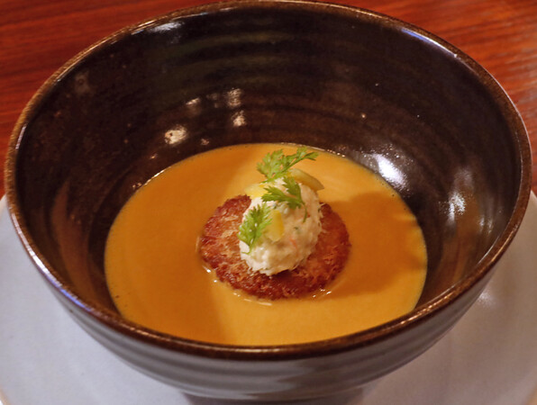 ビスクに蟹の焼きリゾットです。上に蟹の身をサワークリームと和えたもの。セルフイユと柚子。