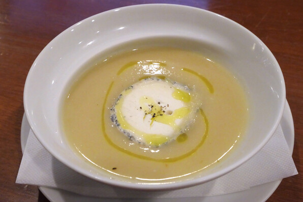 ●ひと皿め、濃厚白菜のスープはそれだけで圧倒的に旨いのに、サントモールドゥトゥレーヌが浮いていて、それが溶けかけていて強烈に美味で仰天。