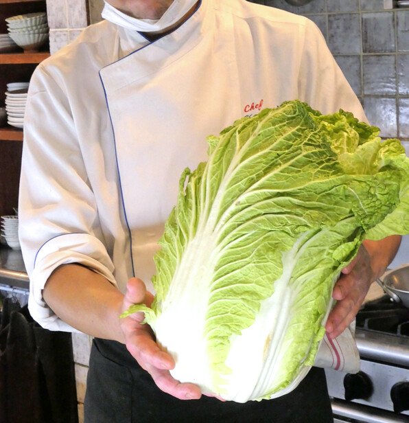 ●のろっち=店主の野呂和美さんが持っているこの白菜です。みっちり重かった、2kg近くあったと思います。