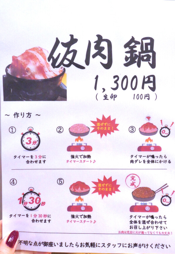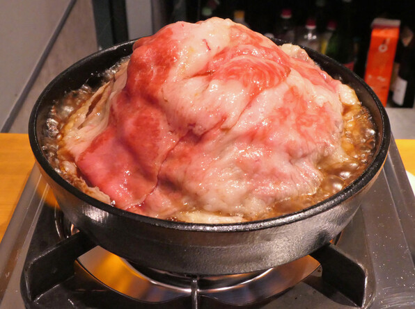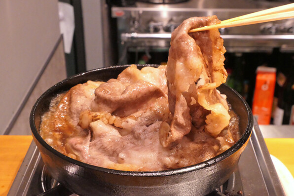 ●濃いすき焼き味の肉を、卵に浸していただきます。下にはみっちりもやしが敷き詰められ、わりしたの味がしみていて、旨いったらありません。
