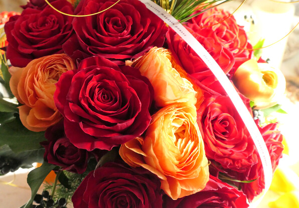 ●華やかな大輪の赤いバラベースに少しオレンジのアクセント入りで、なんとも美しい調和です(^o^)☆☆☆