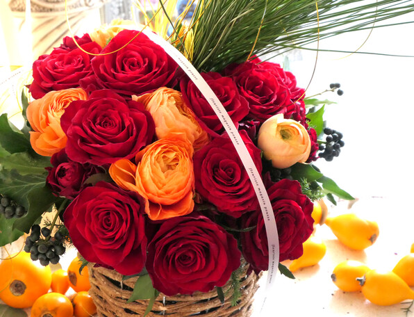 ●金色の水引と松で、お正月仕様のバラのアレンジメント、