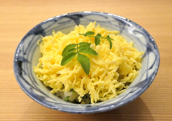 ●小さなちらし寿司。錦糸玉子はふわっふわ。中にごく小さく切ったうなぎ、椎茸、おくら入り。