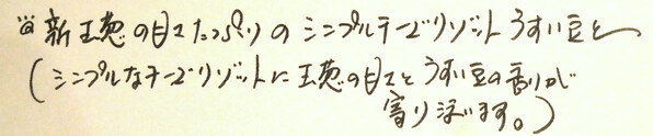●こういうものね。玉ねぎの甘さにうすい豆の香りが寄り添っていたかどうか、、寄り添うというより引き立て合っていた感じ。うすい豆の食感よかったです。大寒前というのにお皿の上は少し春だー\(^o^)/\(^o^)/