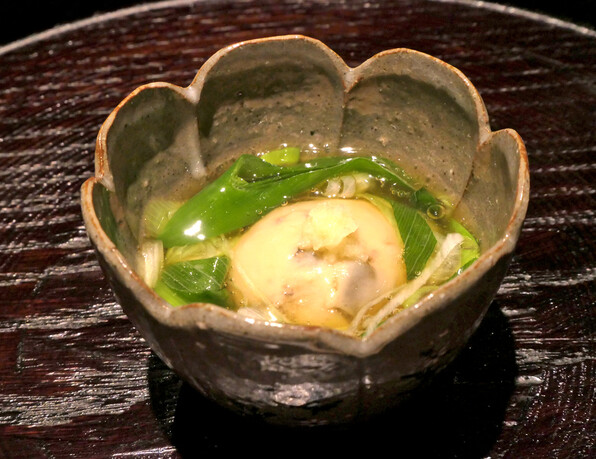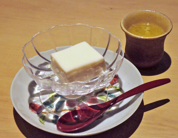 ●先付1 すっぽん豆腐 胡麻豆腐にすっぽん入り。すっぽんだしのあん。九条ねぎ、生姜。