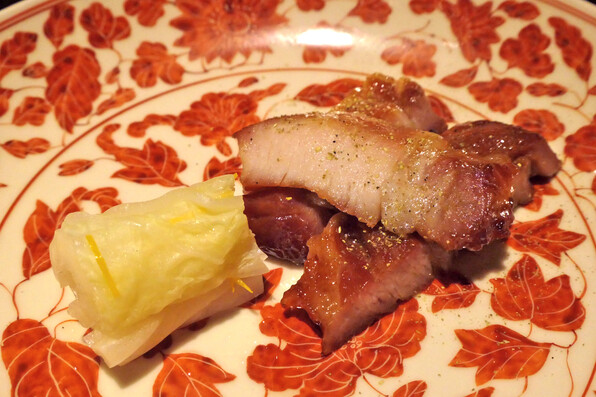●焼き物はいつものチャーシュー。味噌床に漬けて焼いたもので、ものすごく味がしみていて旨みたっぷりです。合わされるものが毎月替わって、今月は白菜。少し甘酢漬けみたいな感じで粋な風味を添えていました。