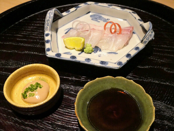 ●お造り2 水口商店さんの鯛。紅白のよりにした人参と大根。醤油と肝醤油。