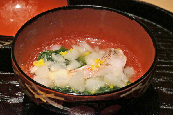 ●お椀は肉厚のちぢみほうれん草に甘鯛、氷蕪(雪に見立てて砕いた蕪)、あられ柚子。