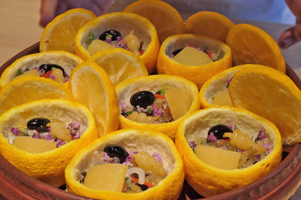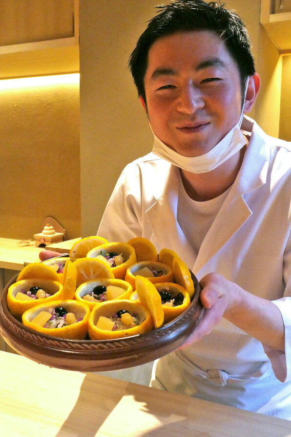 ●そして次、この柚子釜の酢の物も、丸いお盆に柚子を並べて盛り込んでいる最中からかわいいなあと思い、